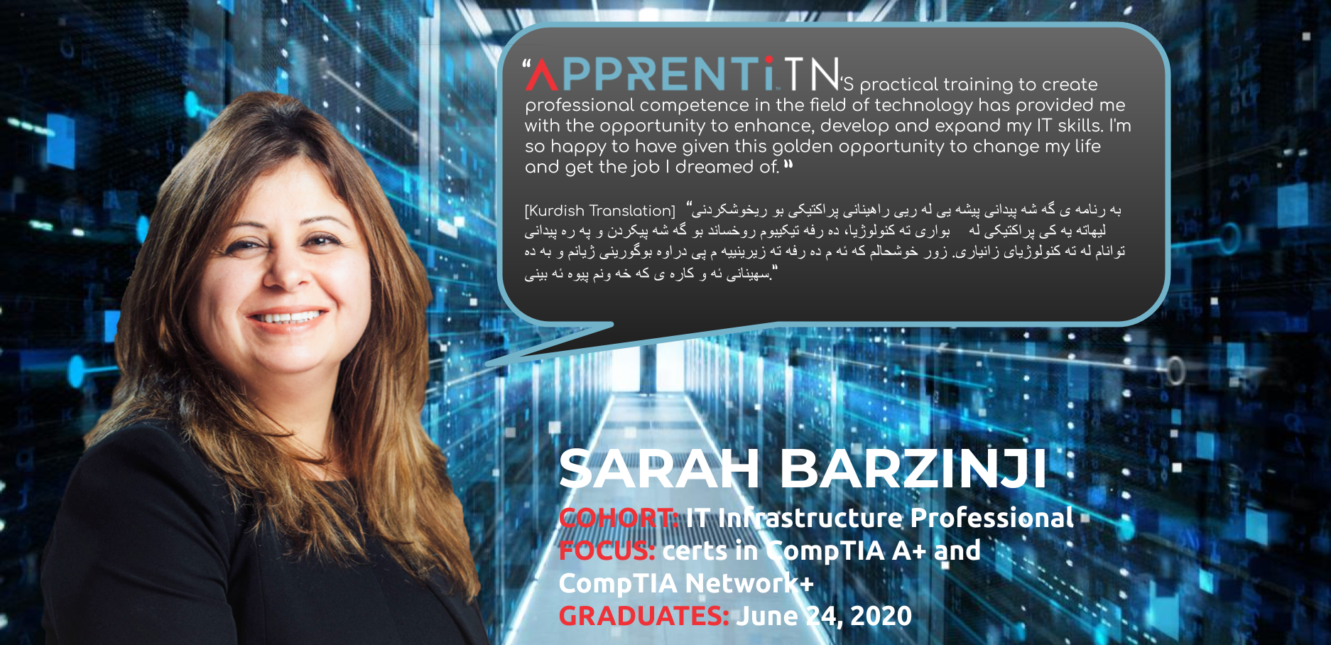 Sarah Barzinji has been enrolled in ApprentiTN, an apprentice model that combines tech classroom instruction with one-year of paid on-the-job training. Sarah started the IT Infrastructure Professional cohort last March and is set to graduate June 24th. She is currently working towards CompTIA certifications. Sarah is an experienced IT professional with project management and procurement background offering technical expertise in purchasing products and services. She is Multi-lingual in Kurdish, Arabic, and English. She worked with US Army using languages and IT skills as culture adviser / IT consultant.